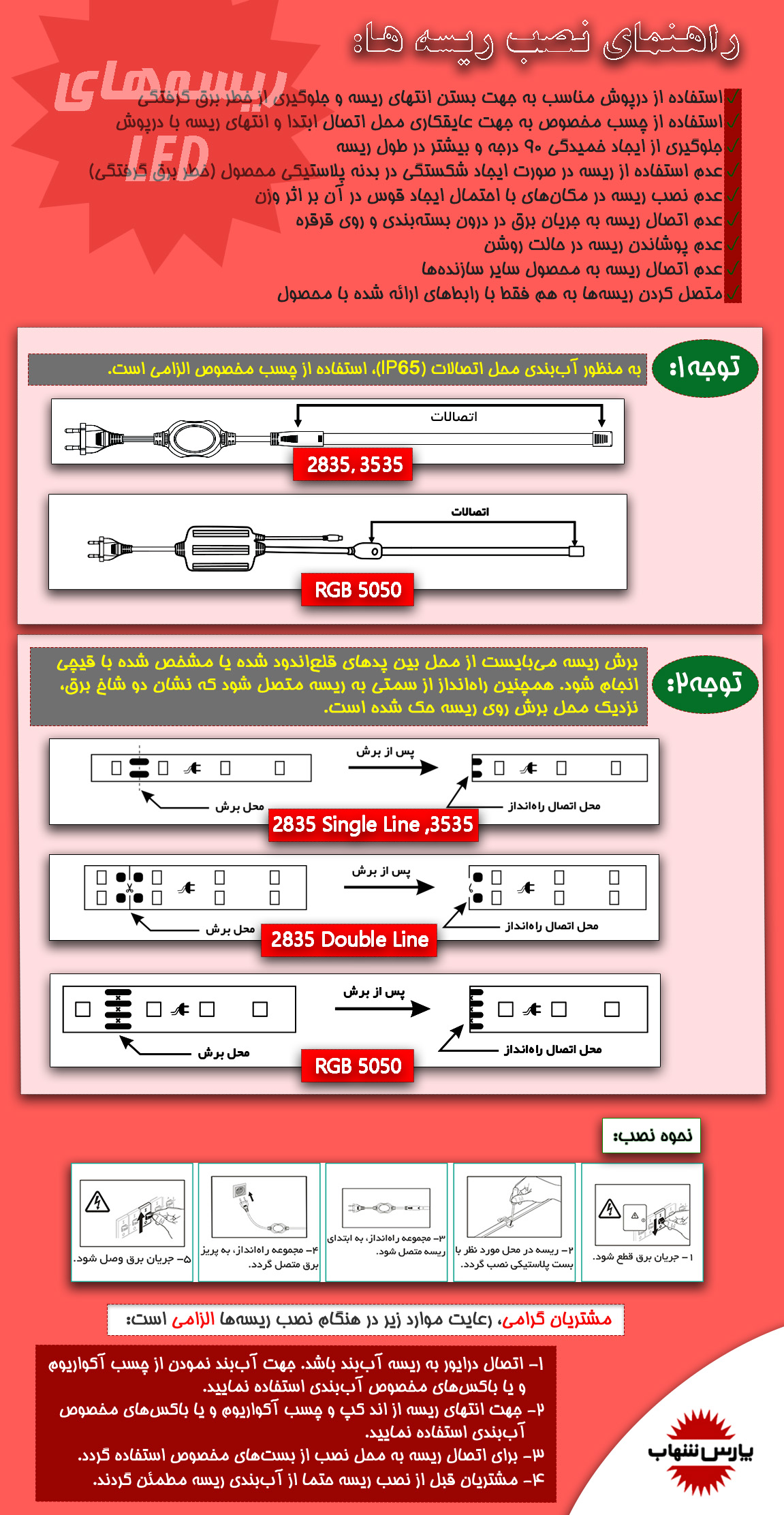 • عدم نصب ریسه در داخل آب و یا در محیطهای قابل انفجار و اشتعال.